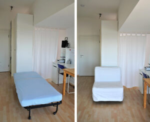 Zusätzlicher Schlafsessel mit gutem Lattenrost – Blick auf die Schrankseite (Bett hinter dem Vorhang)