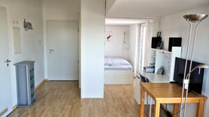 Blick auf Schlafecke mit Doppelbett 1,40 m; davor der Schreibtisch